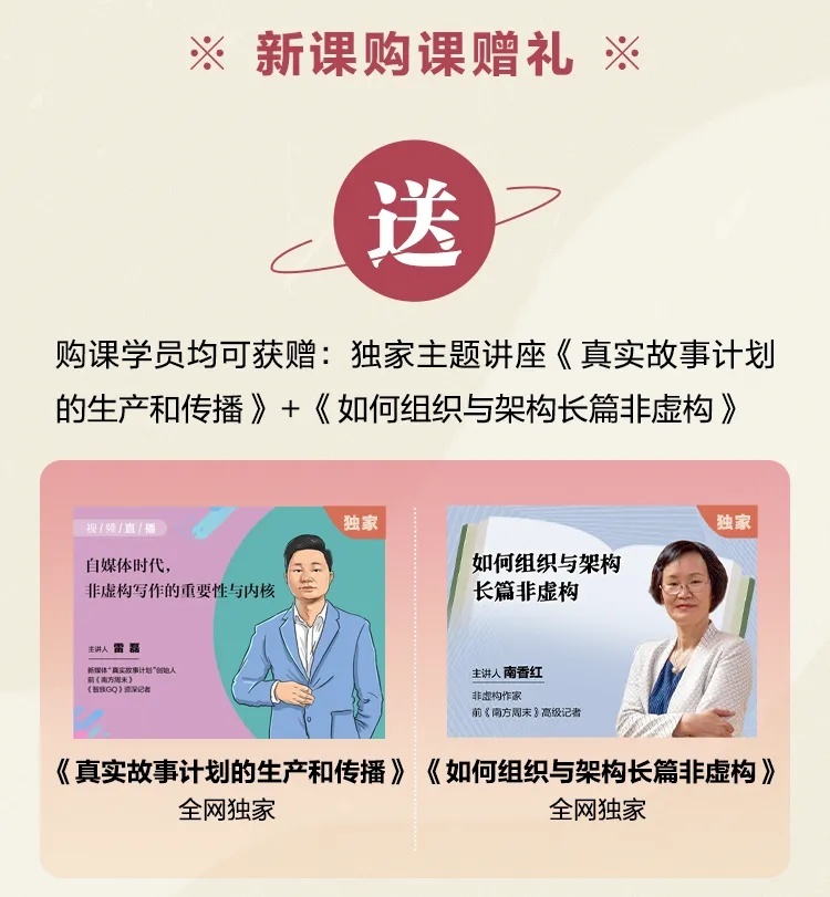 购课学员均可获赠:独家专题讲座《真实故事计划的生产和传播》+《如何组织与架构长篇非虚构》