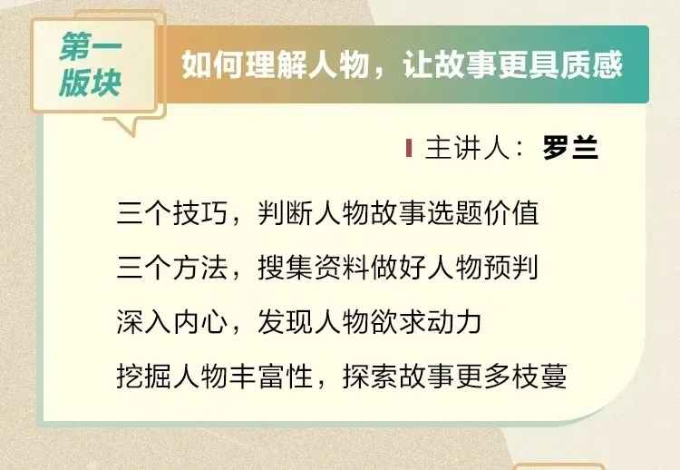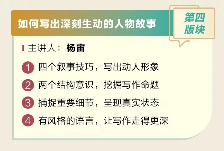 此外,更有嘉宾课讲述怎样写好人物传记。对人物传记感兴趣的同学,一定不要错过。人物传记作家周桦老师将从写作人物传记的基本原则、如何整理人物资料、如何搭建传记的文稿结构和如何写出丰富动人的人物内核,四个维度教你从0到1写好一篇甚至一部人物传记。