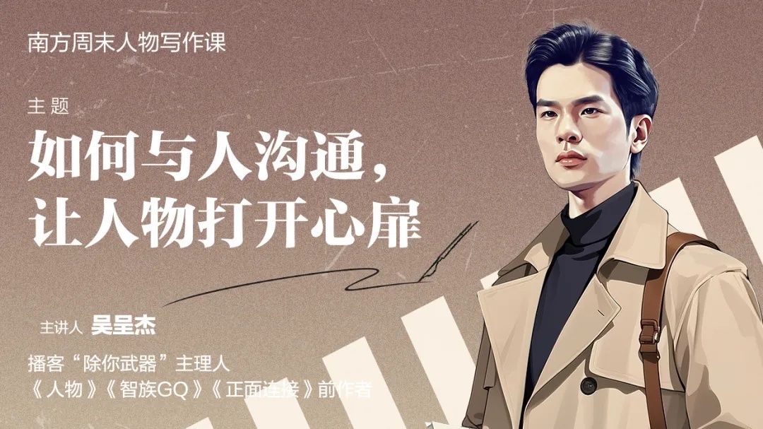 第二步,打开人物心扉。确定选题之后,接下来的压力就是采访。很多人都将采访视如畏途。《人物》《GQ》《正面连接》前作者吴呈杰讲师会陪你探究从零开始认识陌生人,建立深度关系捕捉关键信息。
